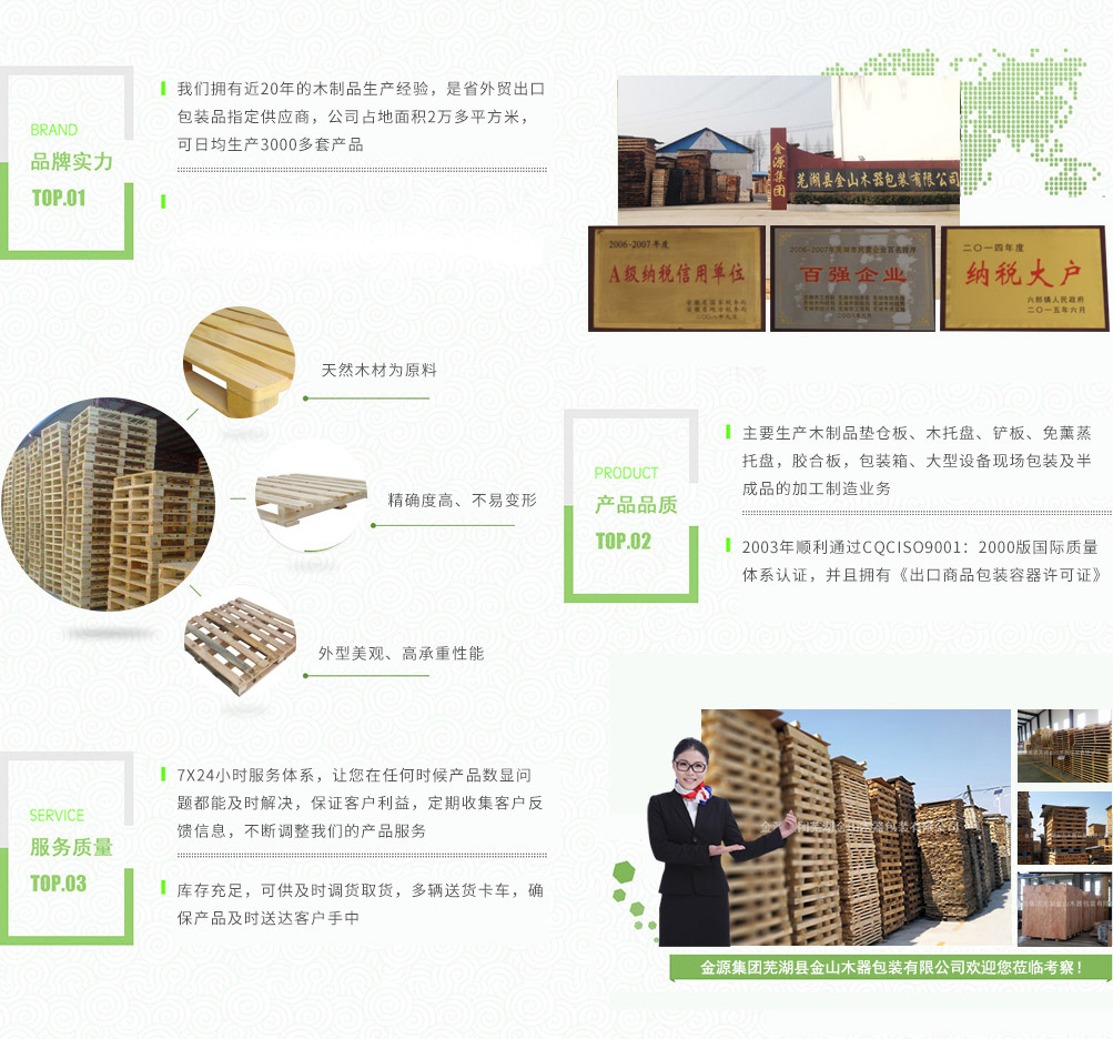 金源集團(tuán)蕪湖金山木器包裝有限公司是省外貿(mào)出口包裝品指定的供應(yīng)商,主要生產(chǎn)木制品墊倉(cāng)板、木托盤、鏟板、免薰蒸托盤,膠合板,包裝箱、大型設(shè)備現(xiàn)場(chǎng)包裝及半成品的加工制造業(yè)務(wù)。產(chǎn)品廣泛用于物流,倉(cāng)儲(chǔ),港口,碼頭,機(jī)械,建材,化工,紡織,食品,超市,五金電器等行業(yè)。公司占地面積2萬(wàn)多平方米,注冊(cè)資金壹佰壹拾捌萬(wàn)圓整,公司擁有員工160多人,其中技術(shù)人員占25%,可日均生產(chǎn)3000多套產(chǎn)品,年產(chǎn)值6000多萬(wàn)元,公司下轄木材加工廠,組裝廠,并備有大型標(biāo)準(zhǔn)烘房,多功能平板刨,壓刨,挖槽,機(jī)械設(shè)備等。產(chǎn)品主要銷往國(guó)內(nèi)大中型城市并隨貨通行出口國(guó)外。